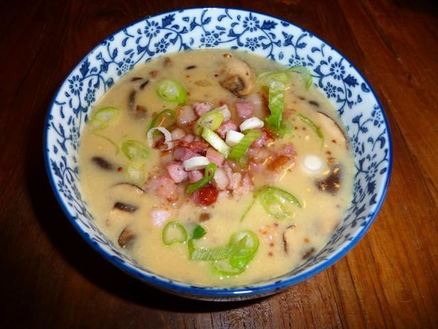 Stevige Limburgse mosterdsoep met bier, kaas, champignons en spekjes