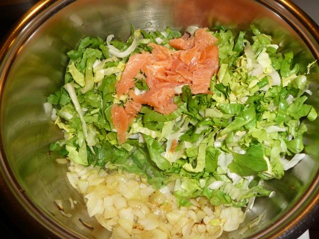 - Bak in een nadere pan de uien, draai het vuur uit en voeg de gesneden andijvie en zalmreepjes toe.