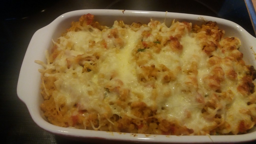 Ik ben een beetje van het recept afgeweken door er zelf geen erwtjes in te doen en de macaroni te gratineren. Dat vond ik gemakkelijker, want dan kun je de macaroni wat eerder klaarmaken en voor het eten nog even in de oven zetten.