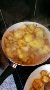 Verhit de boter, fruit hierin de fijngesnipperde ui en rode peper, voeg blokjes aardappel en bloemkoolroosjes toe, kruid met kurkuma en kerrie, overgiet met 1,25 dl. water, meng het geheel en laat onder deksel zacht sudderen gedurende 10 minuten. Garneer met bieslook en dien op.