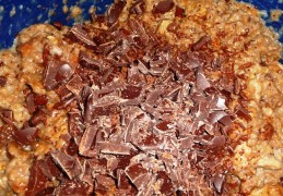 - Hak de chocolade in fijne stukjes. Gebruik hiervoor een scherp mes. Zo krijg je een mengeling van chocoladeschilfers en kleine chocoladebrokjes. Meng de chocoladestukjes onder het broodbeslag. Meng eventueel een klein snuifje zout onder het beslag.