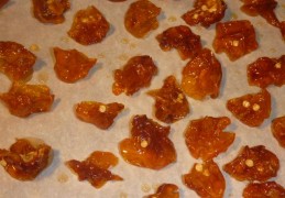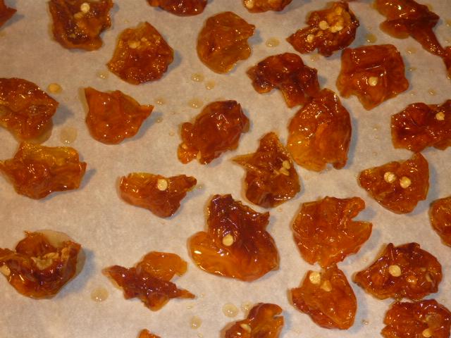 Haal na 20 minuten de pepers uit het suikerwater en leg ze op een, met bakpapier beklede bakplaat, en doe ze 2 uur in de oven op 90 graden.