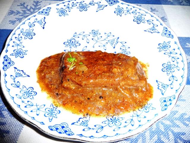 - Doe het vlees terug in de pan (het vlees moet volledig onder staan) besmeer de snee brood met mosterd en leg deze bovenop. Doe het deksel op de pan en zet dit 1 ½ in de oven.