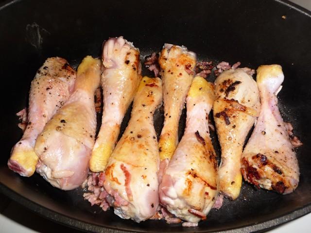 - Bak het spek op laag vuur uit in een ovenvaste braadplan. Verhoog het vuur en doe de kip erbij. Braad de drumsticks rondom bruin en neem ze uit de pan.