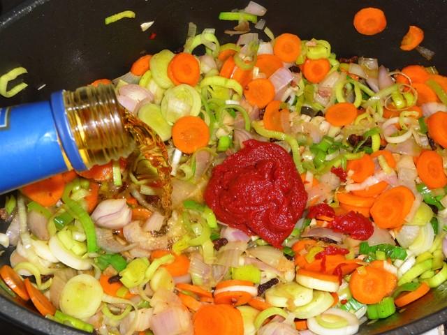 - Voeg de sjalot, prei, wortel en knoflook toe en bak deze ± 3 min. in het braadvocht.