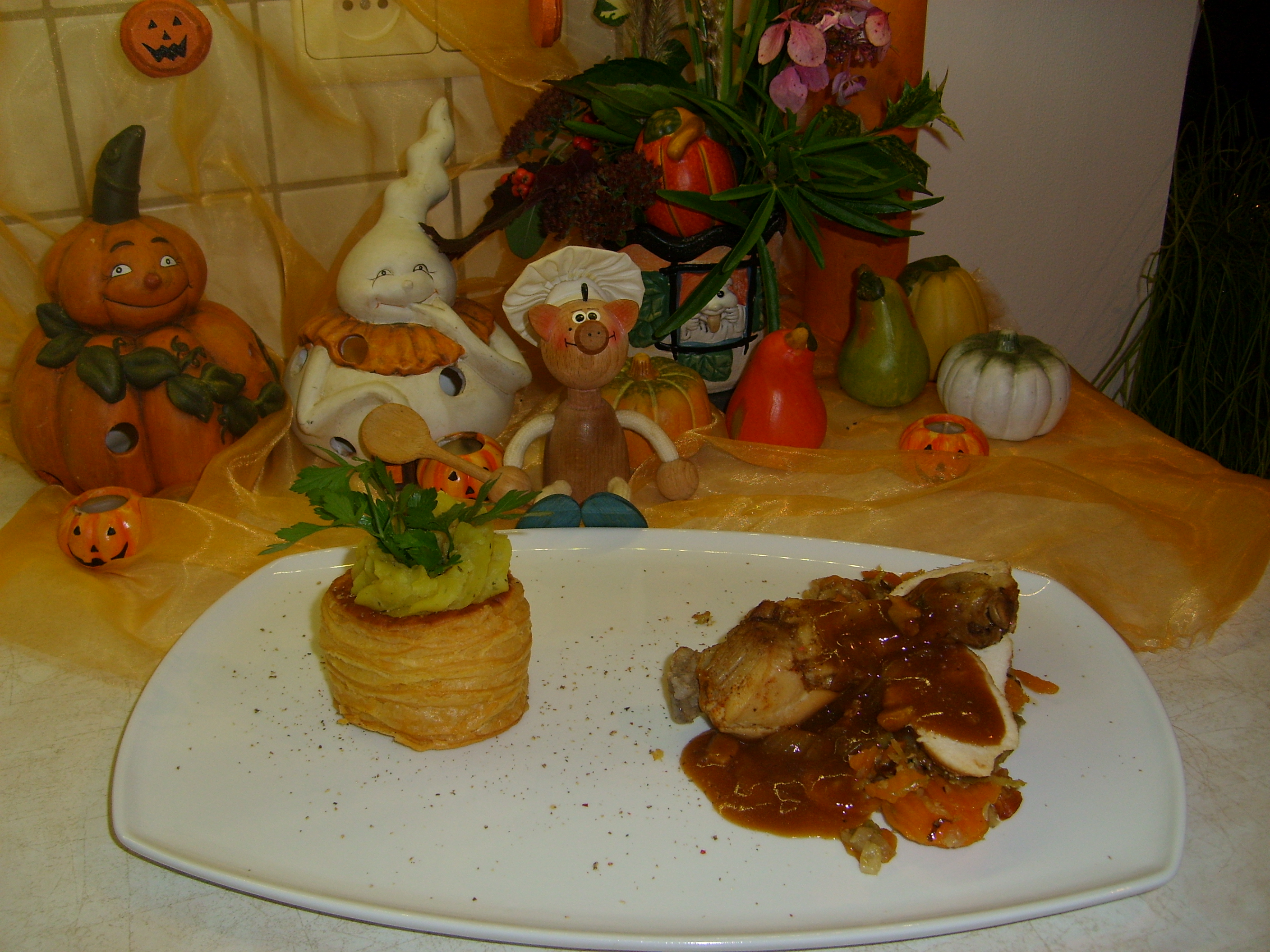Kippenfilets goed kruiden met de kippenkruiden en aanbakken in boter evenzeer de onderbouten.