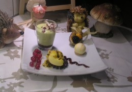 Schik alle ingredienten op bord en garneer af met coullis en balsamico appelsien .