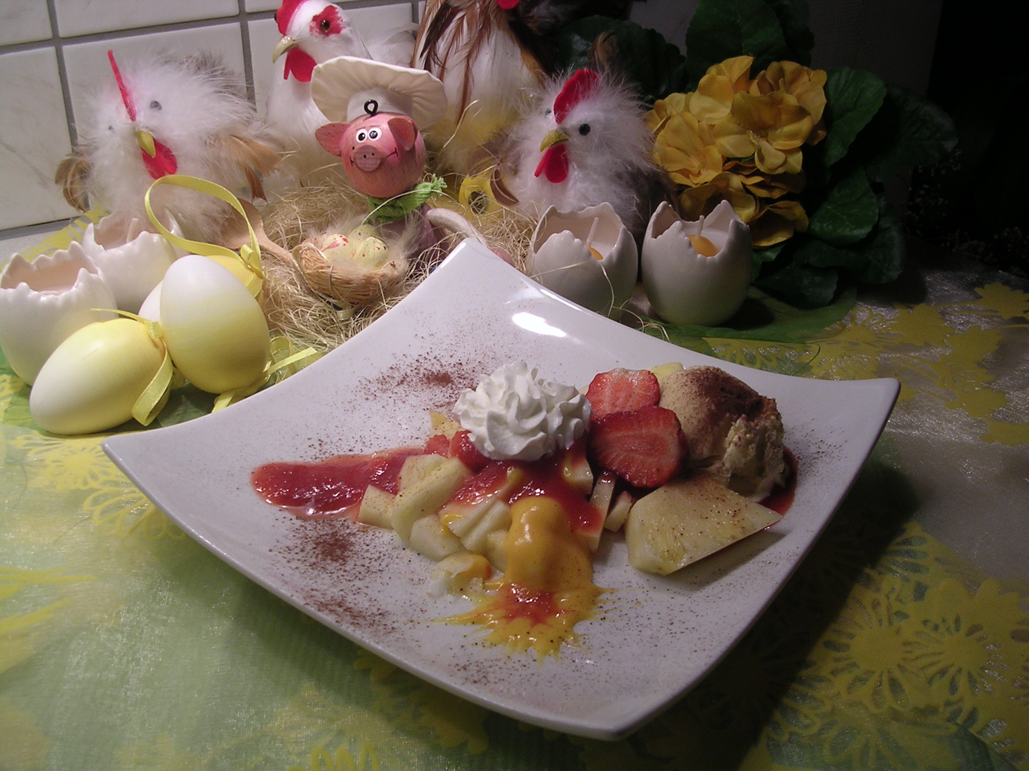 Dessert : kaneelijsje met ananas en aardbei en ...