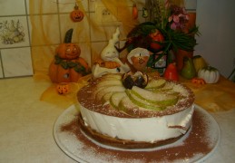 Dessert: platte kaastaart met cocos en peren