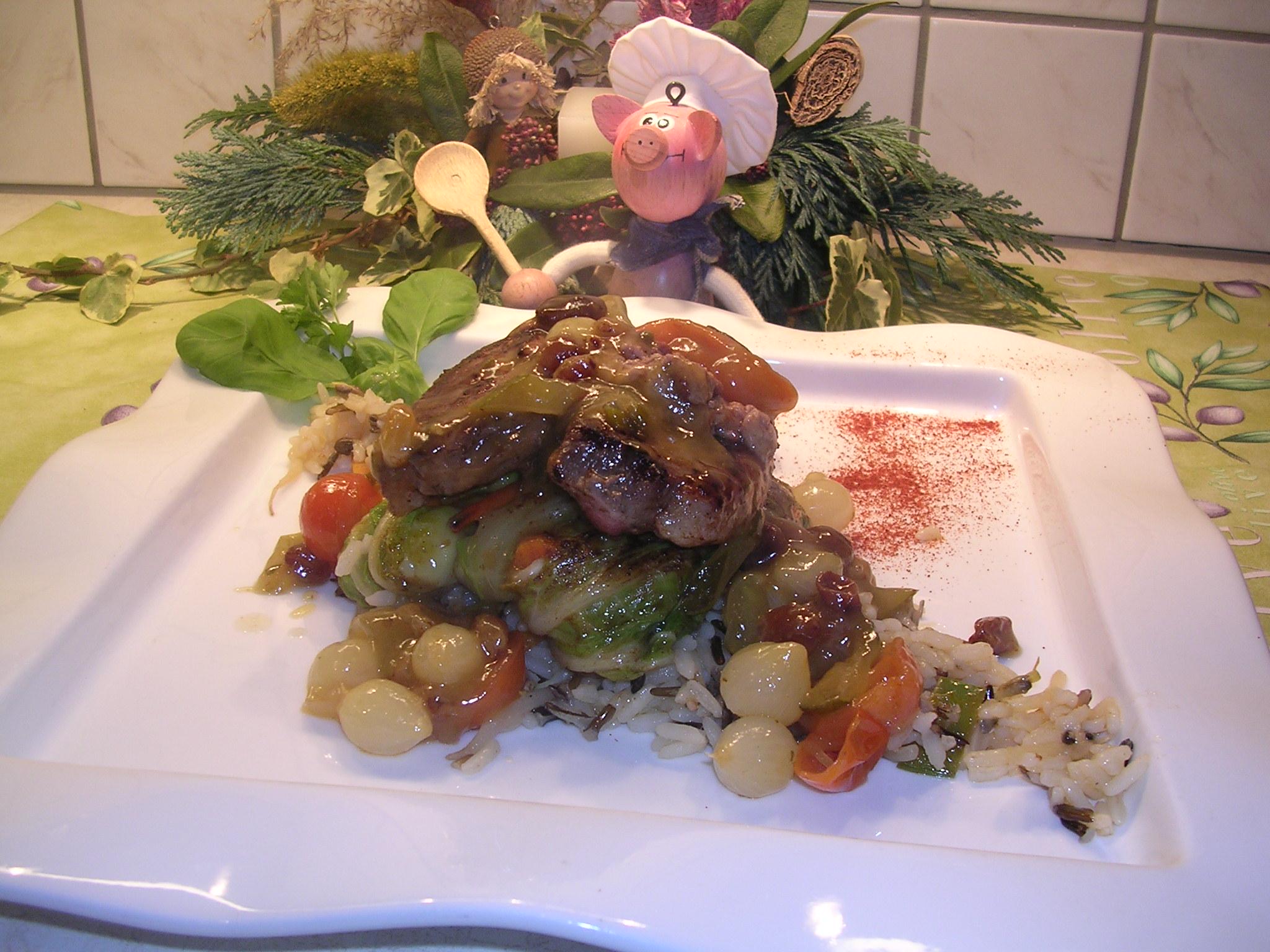 Bak de tournedos op een hevig vuur aan weerszijden goed aan.De groenten, zie mijn recepten pagina " groenten gewoon opgewokt met witte wijn en... " in geblanceerde spitskool draaien.Deze op een hevig vuur aanbakken.Dresseer dit alles op bord.
