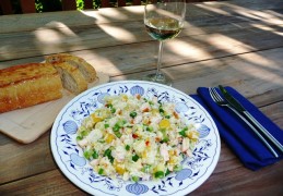 - Maak de afgekoelde rijst goed los met een vork en meng er de asperges doorheen, meng er de kip, lente ui en bleekselderij doorheen.