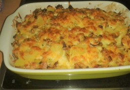 Deze ovenschotel bestaat uit voorgekookte aardappelschijfjes gemengd met prei, champignons, ham en kruidenroomkaas.