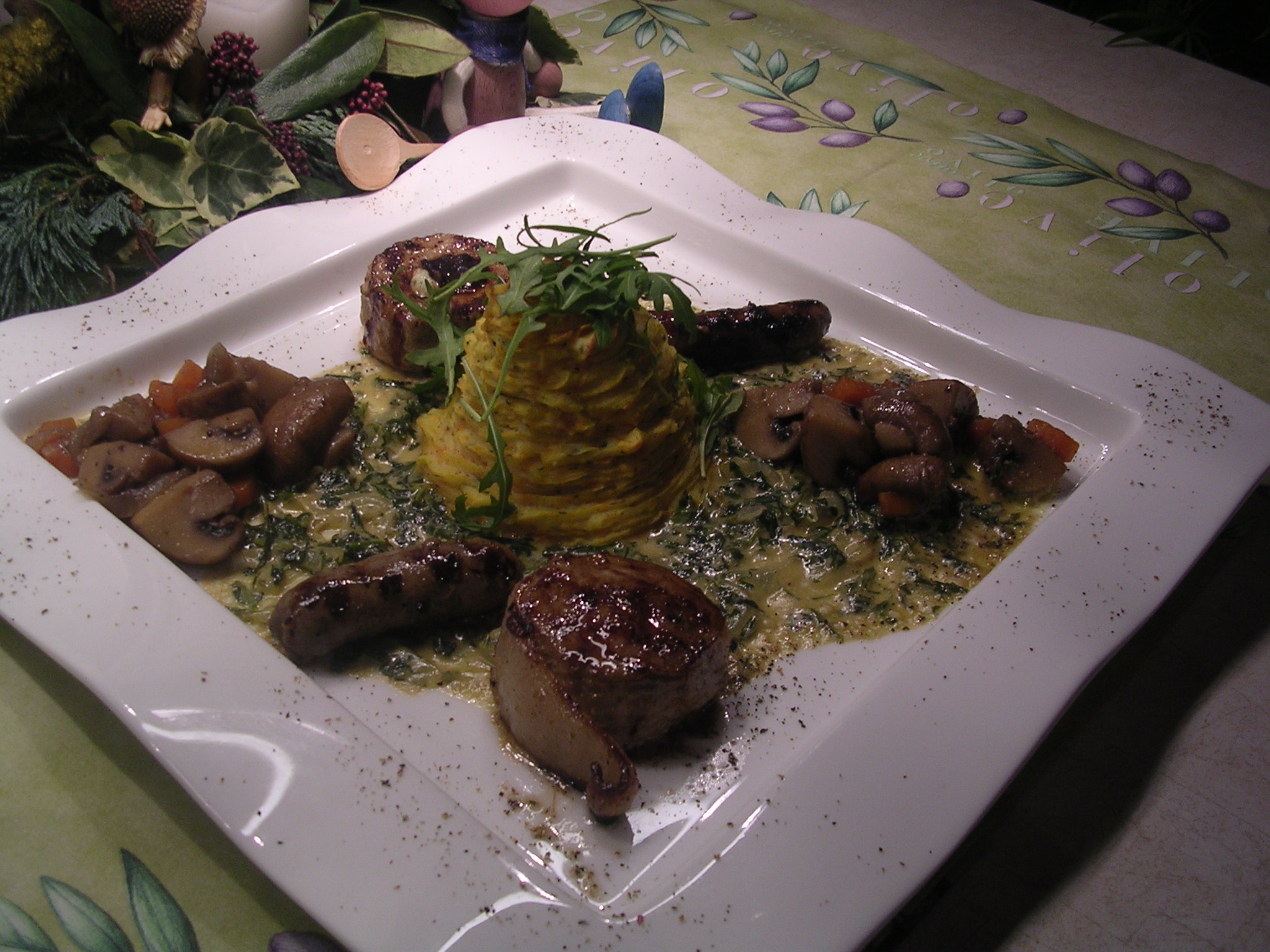 Grill eerst de worsten en daarna de kalfsoester en lamsmedaillon.Serveer dit alles op het bord met puree.