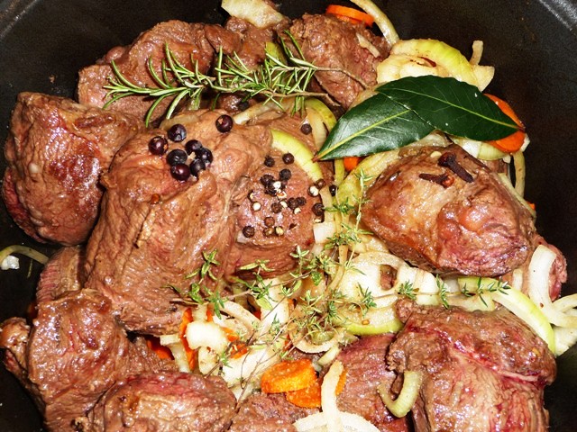 - Giet nu de wildbouillon erbij en zet het geheel op het laagste pitje. Laat ongeveer 2 uur heel zachtjes stoven.