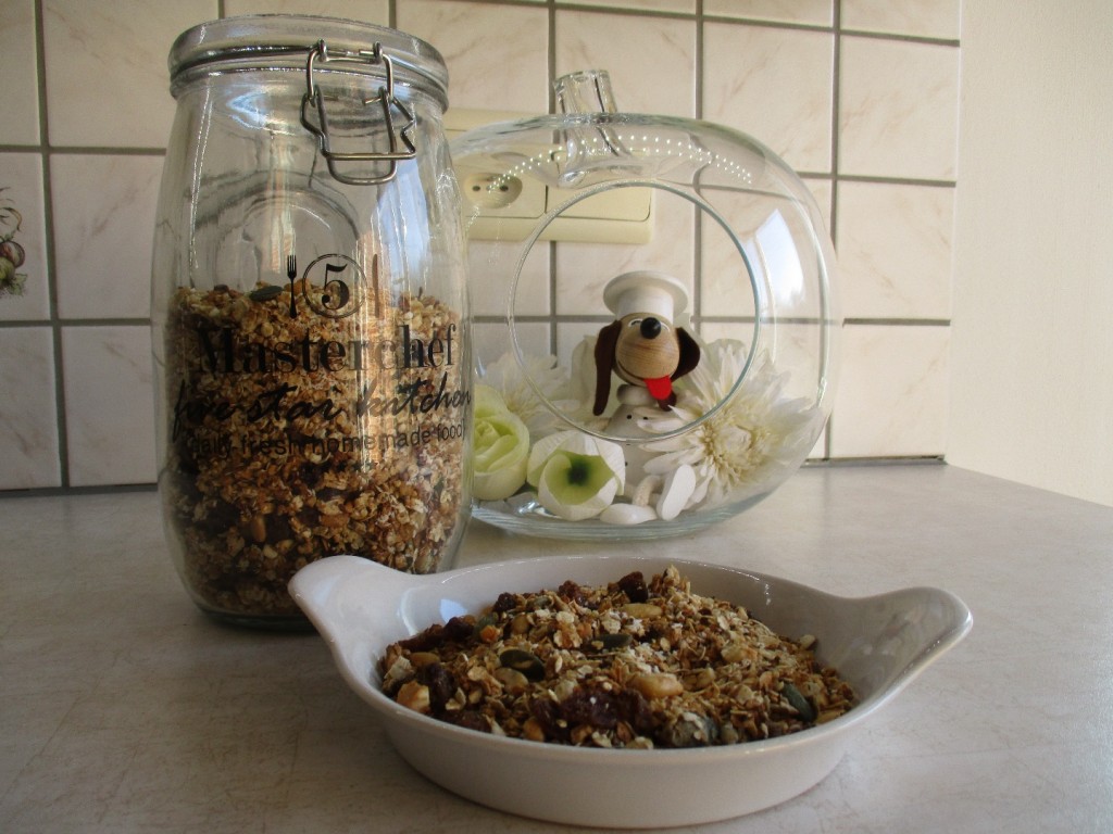 - Oven verwarmen op 180 gr. De noten in grove stukjes hakken meng deze met de havermoutvlokken,honing, zaden en pitten voeg evenzeer de gesmolten coco'svet toe. Verdeel alles op een bakplaat en bak +/- 20 min in de voorverwarmde oven, roer regelmatig om. Laat afkoelen en meng de krenten eronder. Je kan evenzeer cannebergers, gojibessen eronder mengen, evenzeer fondant bolletjes en een beetje kaneel.