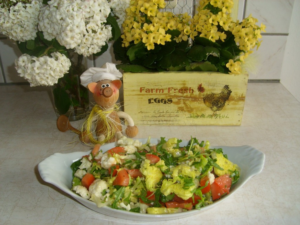 - Snij de sla grof, de tomaat in partjes snijden de rucola iets fijner snijden. Maak een dressing van de olijfolie, mosterd, citroensap en kruid met peper en zout. Meng de dressing onder de groenten en serveer zeer fris.