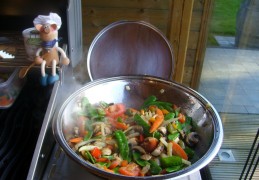 - Warm de zonnebloemolie op in een grote wokpan, eerst de harde groenten even opwokken vervolgens de zachte groenten toevoegen. Kruid naar smaak af.