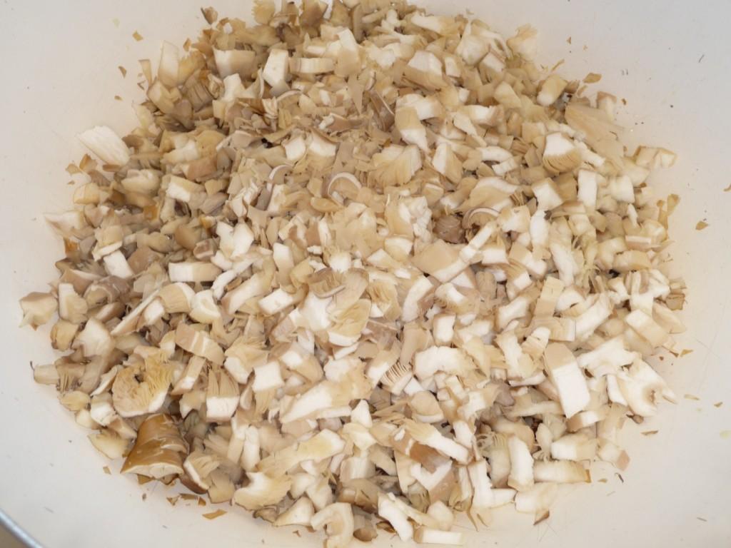 - Snijd de oesterzwammen in fijne stukjes, bak ze in 5-7 minuten goudbruin en laat ze afkoelen.