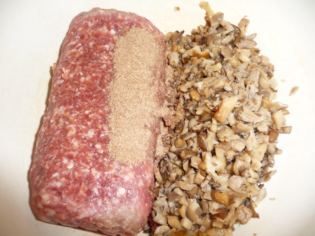 - Meng de gebakken oesterzwammen met het gehakt, ei, paneermeel en 1 koffielepel hamburgerkruiden.