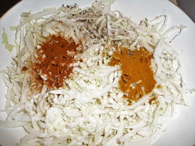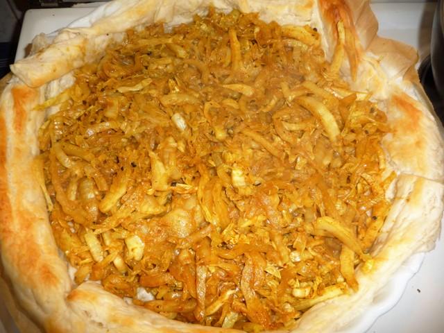 - De Chinese kool in een beetjeolie stoven gedurende 10 à 15 minuten, bestrooi met peper, zout, paprikapoeder en kerrie en roer af en toe. Dan de voorgebakken bodem uit de oven halen en de kool over de bodem verdelen.
