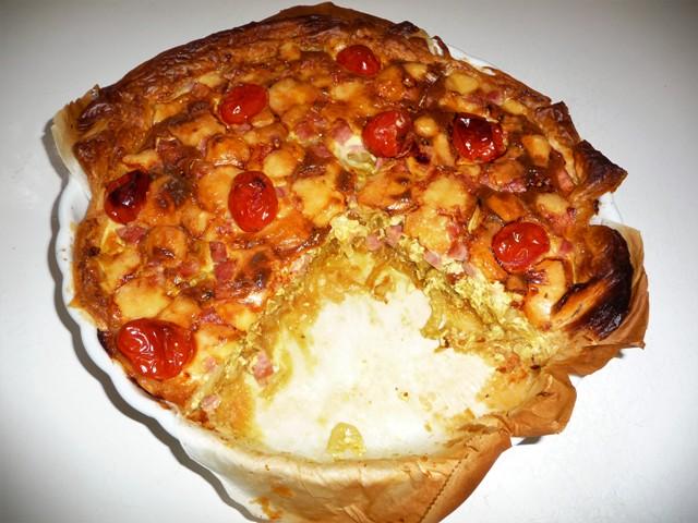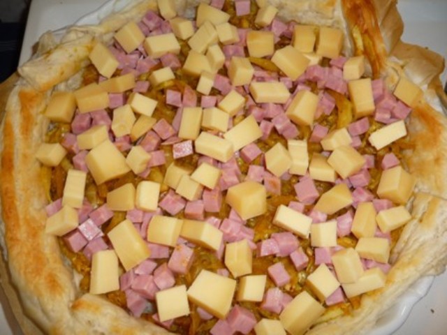 - De oven voorverwarmen op 200°C, bladerdeeg in de vorm doen (met bakpapier) en de bodem alvast +/- 10 minuutjes voorbakken, dit voorkomt een kleffe bodem.