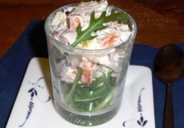 - Voor de glaasjes: doe wat rucola op de bodem en schep er wat van het mengsel op. Garneer met een blaadje rucola en eventueel met wat pijnboompitjes. (die was ik vergeten toen ik de foto maakte).
