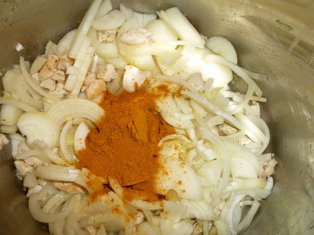 - Voeg nog wat olijfolie bij het bakvet en bak hierin de uien met kerrie 2-3 minuten.