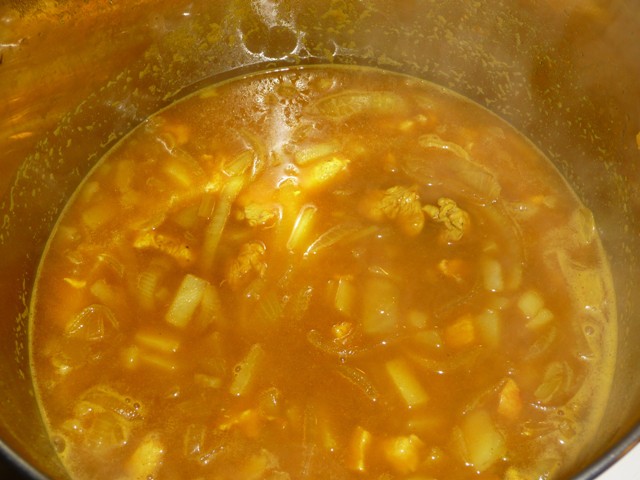 - Giet de bouillon erbij en kook zachtjes circa 15-20 minuten.