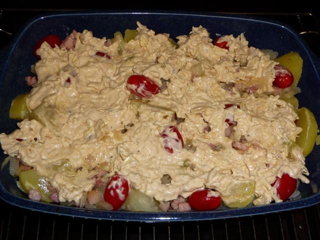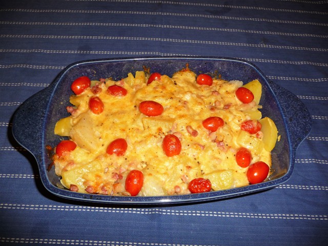Koolrabi-aardappelgratin met spekjes en tomaatjes