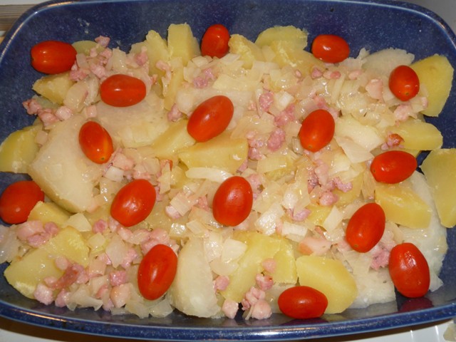 - Bak de spekjes en voeg de gesnipperde ui toe. Laat de ui nog even meefruiten. Schep dit mengsel over de aardappels/koolrabi in de ovenschaal en verdeel de tomaatjes ertussendoor.