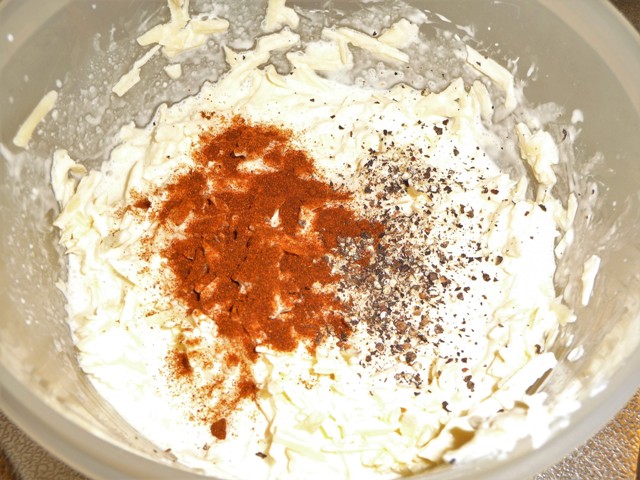 - Rasp de kaas en meng er de room doorheen, voeg peper en paprikapoeder toe en schep alles goed door elkaar. Verdeel het mengsel over de rest in de ovenschaal.