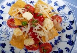 - - Maak van de tomaatjes, mozzarella, ui, basilicum een salade en voeg olijfolie en peper & zout toe.