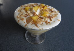 - Laagjes maken in een glas en garneren met een beetje koekkruimels, stukjes mango en amandelschaafsel.