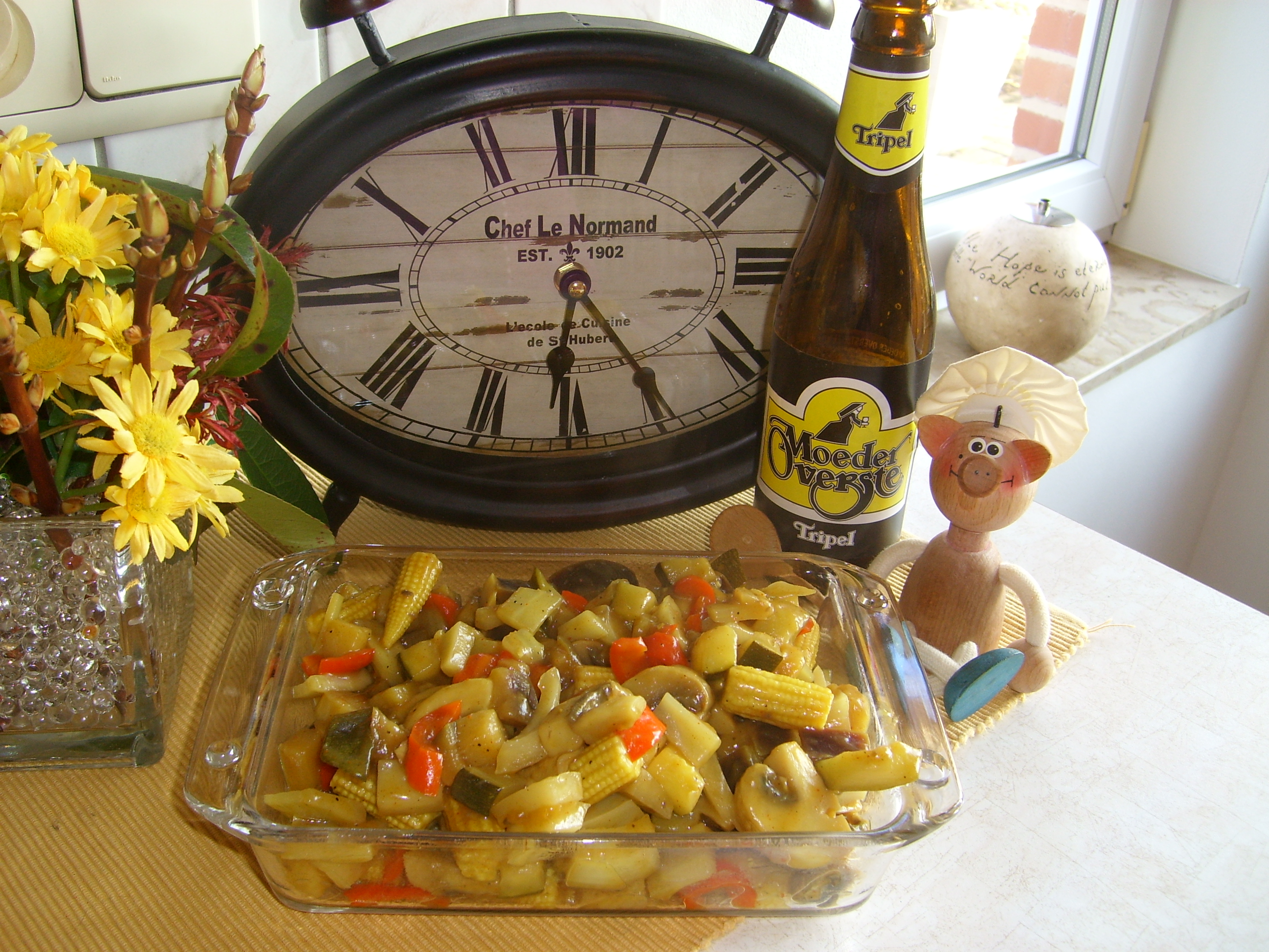 De groenten goed kruiden en opstoven met een half flesje Moeder Overste Tripel, indien nodig een beetje bijbinden.