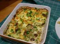 Een lekkere en gemakkelijke vegetatiche ovenschotel bestaande uit doperwten, aardappelschijfjes, champignons en brie.