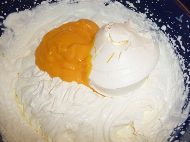 - Klop de slagroom met de vanillesuiker tot bijna stijf en meng de mascarpone en 75 ml advocaat er met de mixer doorheen tot een mooi romig geheel.