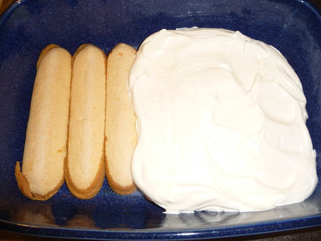 - Doe de helft van het mascarpone mengsel op de lange vingers in de schaal.