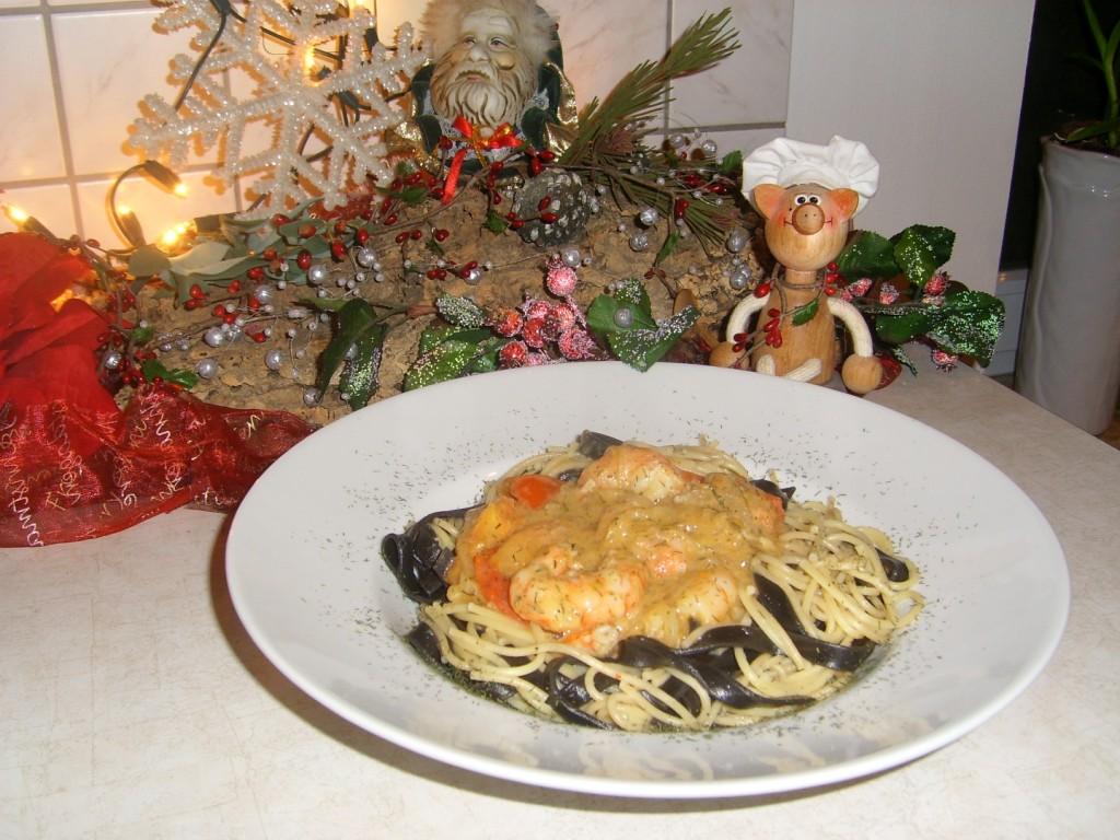 Pasta: duo van spaghetti en tagliatelle nero di seppia vergezeld van scampi's in een romig zalmsausje