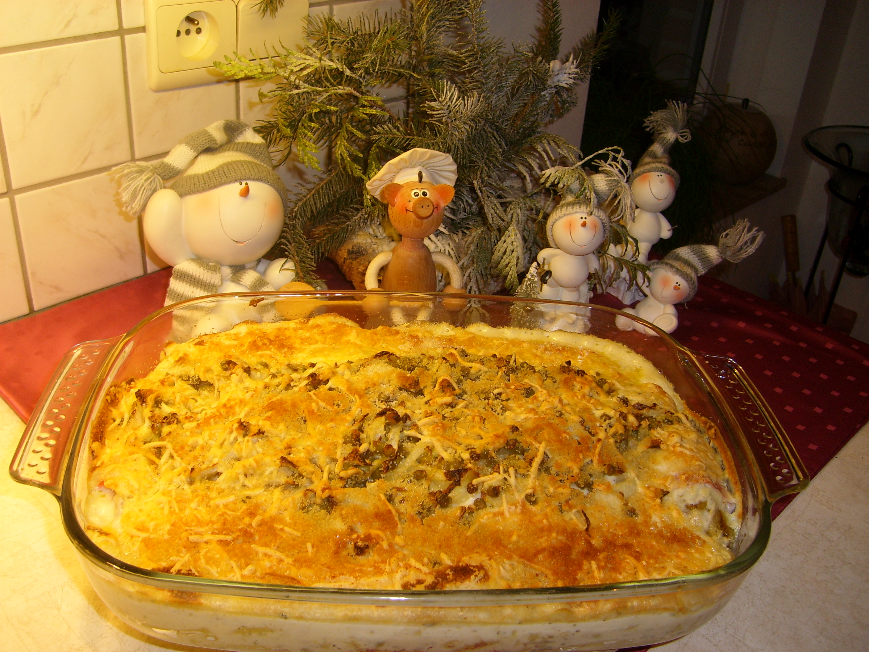 Maak een bechamelsaus van de boter, bloem en melk voeg 150 gr gemalen kaas toe evenzeer kruiden.
