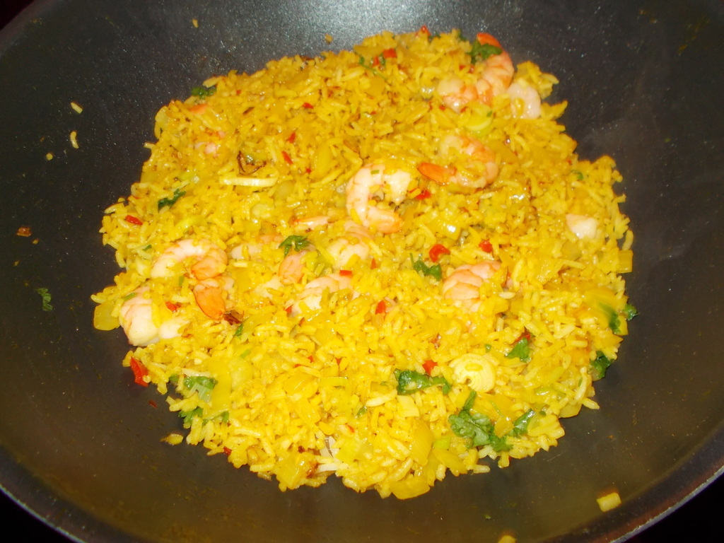 Lekker snel gerecht, vooral als je - zoals ik - nog een restje rijst over hebt. De rijst heb ik gebakken met rode peper, ui, knoflook en flink wat kerrie. De mango-chutney en de garnalen maken het geheel af.