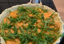 - Zoete aardappel schillen deze in schijven snijden deze halfgaar koken in licht gezouten water. Bloemkool in roosjes verdelen deze evenzeer half gaar koken. Baconreepjes samen met de fijngesneden puntpaprika even opbakken. Eieren loskloppen met de room neem een taartvorm en smeer in met boter vervolgens het bladerdeeg erin prik gaatjes in het deeg met een vork. Beleg de bodem met de zoete aardappel kruid met peper, muskaatnoot,dragon, paprika poeder en Fleur de sel dresseer de rucola erover vervolgens de bacon en puntpaprika. Verdeel de bloemkoolroosjes erover en bestrooi met de gemalen kaas, geitenkaas in blokjes gesneden erover verdelen. Schenk de eimassa over het gerecht zet in een voorverwarmde oven op 180 Gr. boven en onderwarmte bak deze +/- 40 min tot de eimassa is gestold. En nu maar smullen