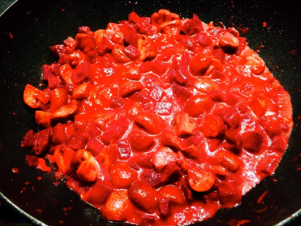 - Voeg vervolgens de gezeefde tomaten toe en breng dit aan de kook. Verlaag het vuur en laat dit nog een ongeveer een uur zachtjes koken of totdat de bieten beetgaar zijn.