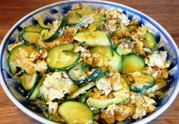 - Was de courgette en snijd een klein stukje van de voor- en achterkant af, snijd hem doormidden en snijd dunne plakjes, klop de eieren.