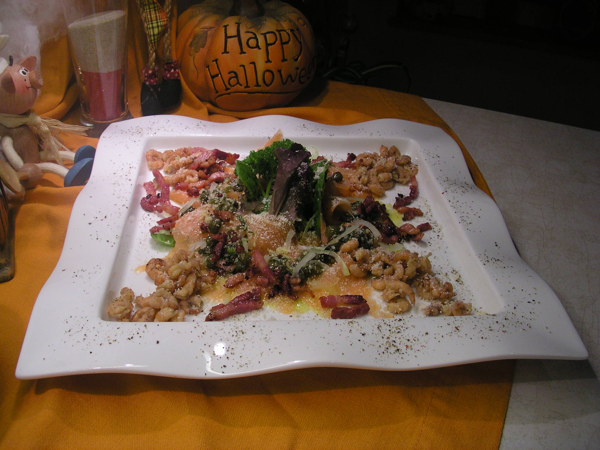 Schik de sla op bord ronddom de vis en besprenkel met de dressing en garneer af met de spekblokjes , noten mix en kaas.