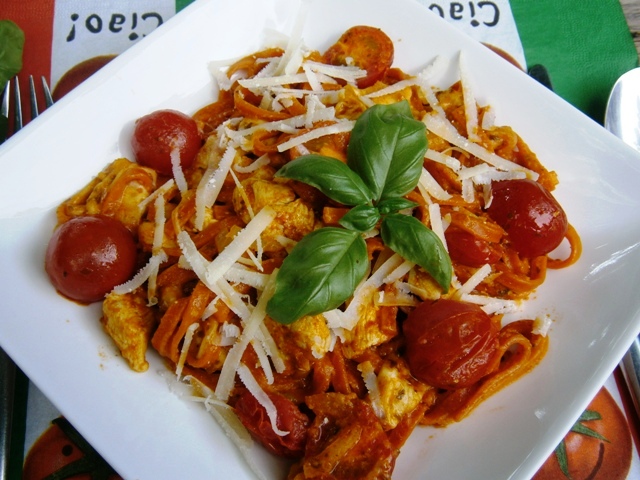 Snelle pasta met kip, tomaatjes, mozzarella en (rode)pesto