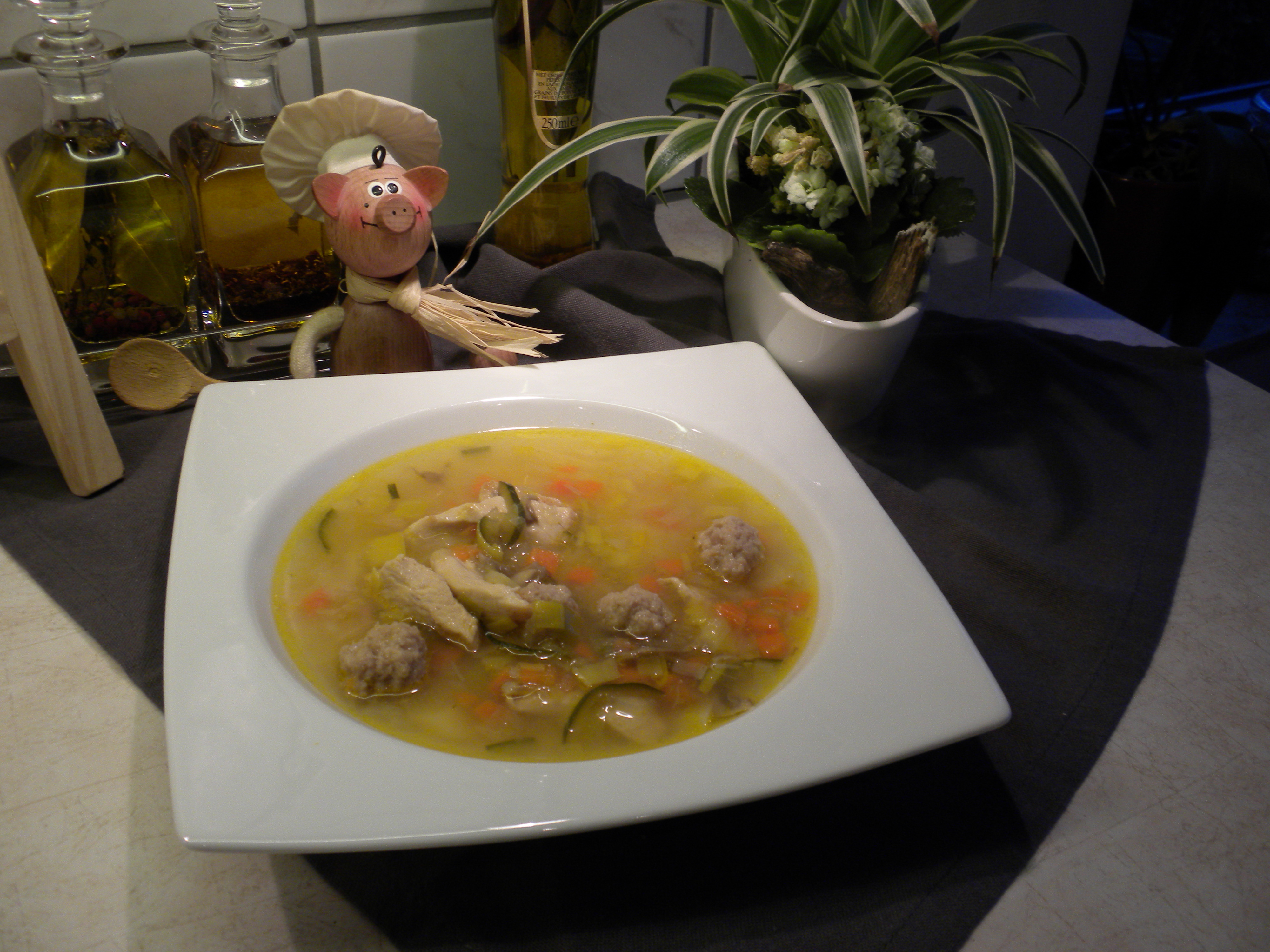 Wok of stoof deze groenten even aan in olijfolie en voeg de bouillon toe. Laat op een zacht vuur sudderen terwijl men de kipfilets in blokjes gesneden even goed aan bakt in de pan met een beetje olijfolie. De bereiding van de balletjes heel simpel : gehak , eigeel , chapelure en kruiden samen en dit alles goed mengen en kleine balletjes rollen. Bak deze ook even aan. Voeg deze bij de kippen - groentenbouillon.