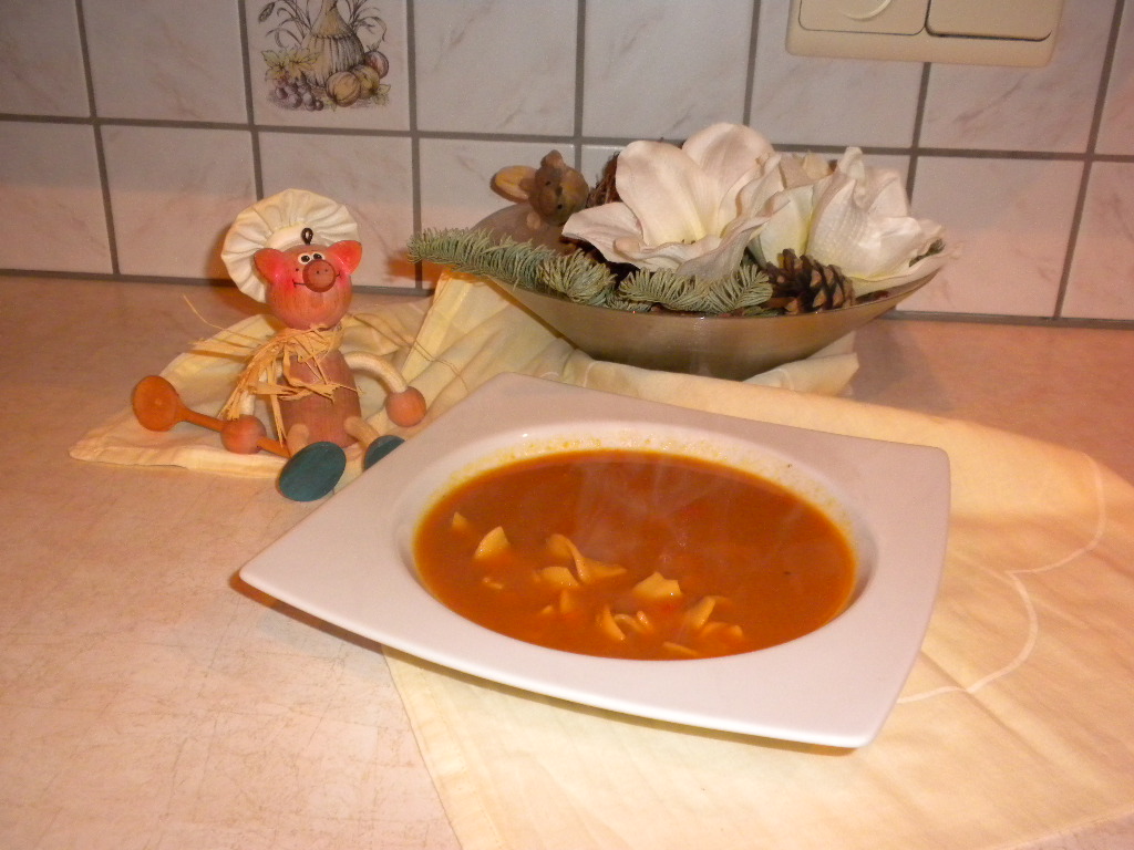 Stoof ze even in boter met de lookteentjes en paprikapoeder, vervolgens regelmatig de bouillon toevoegen na een 20 tal min. de soep goed mixen, pasta verbrokkeld erbij en laat op een zacht vuur nog 10 min. pruttelen.