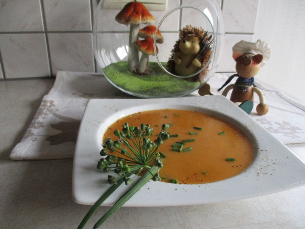 - Ajuin en aardappel in blokjes snijden, pompoen verwijder de schil en snij deze eveneens in blokjes. Gember schillen en in ringen snijden, Look fijn snijden de tomaat ontvellen en in partjes snijden. Stoof deze ingredienten aan in een beetje boter voeg de bouillon en laat op een zacht vuur sudderen. Mix de soep en breng aan de kook serveer zeer warm en werk af met chinese bieslook en tricolore peper.