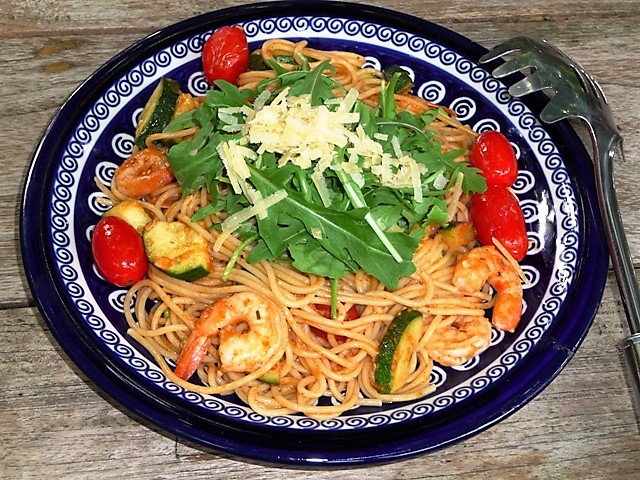 - Voeg de pesto toe, schep alles door elkaar en doe de garnalen en tomaatjes erbij. Laat dit geheel nog 5 minuutjes zachtjes sudderen.