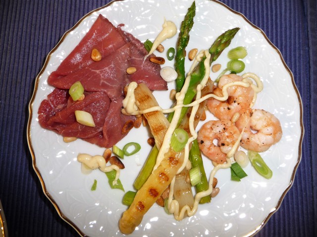 - Wok de garnalen en schik ze samen met de plakjes rosbief en de asperges netjes op een bordje.